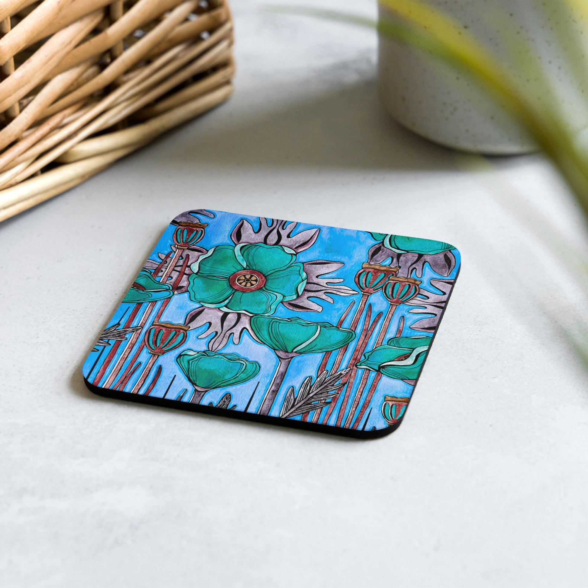 This teal Poppies floral cork-back coaster is a perfect match for your favorite mug! Create a homey feel while protecting your coffee table or nightstand from mug stains and moisture. The coaster is waterproof and heat-resistant, designed to last a long time. Buy it for yourself or as a lovely gift for your friends and family.