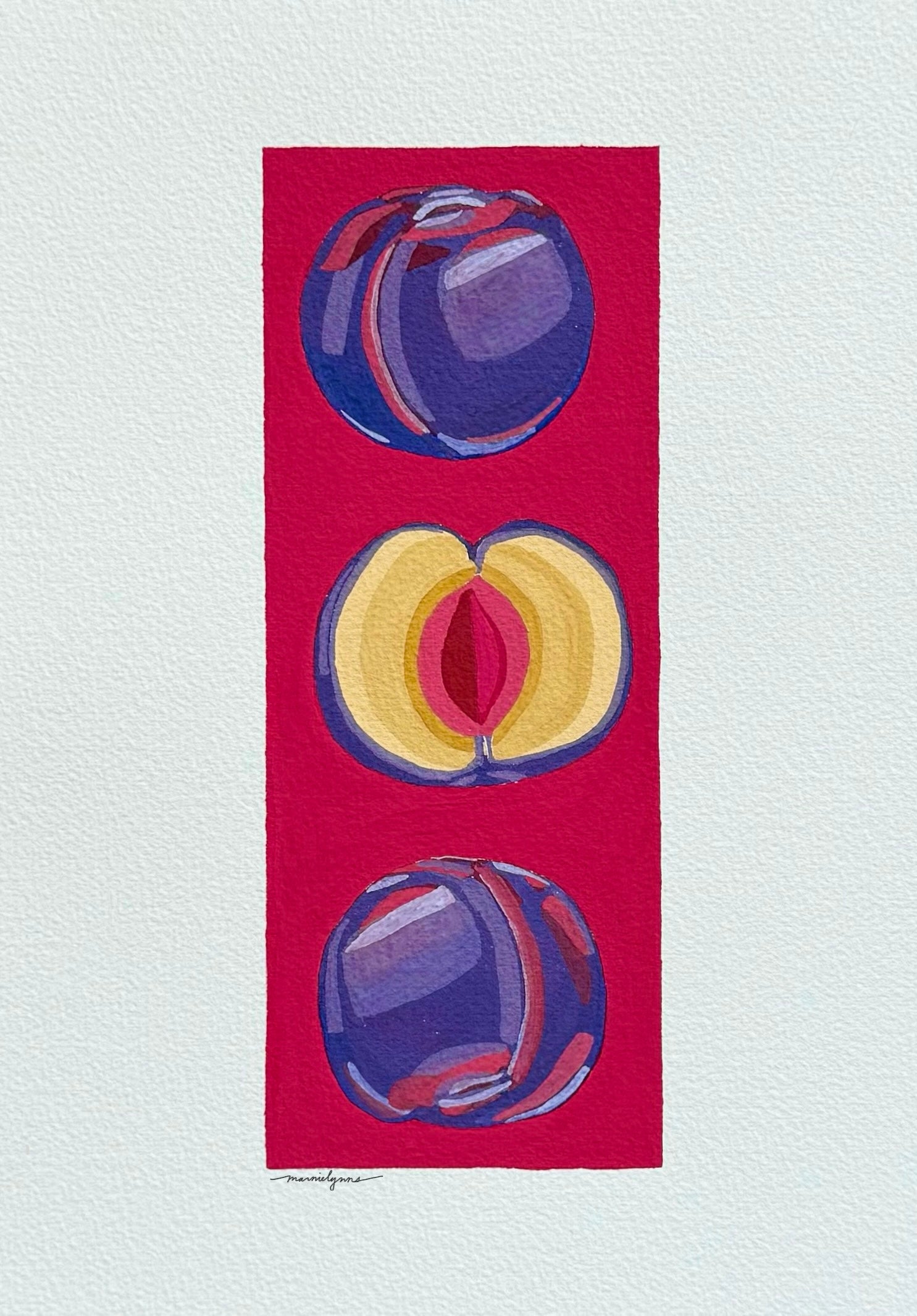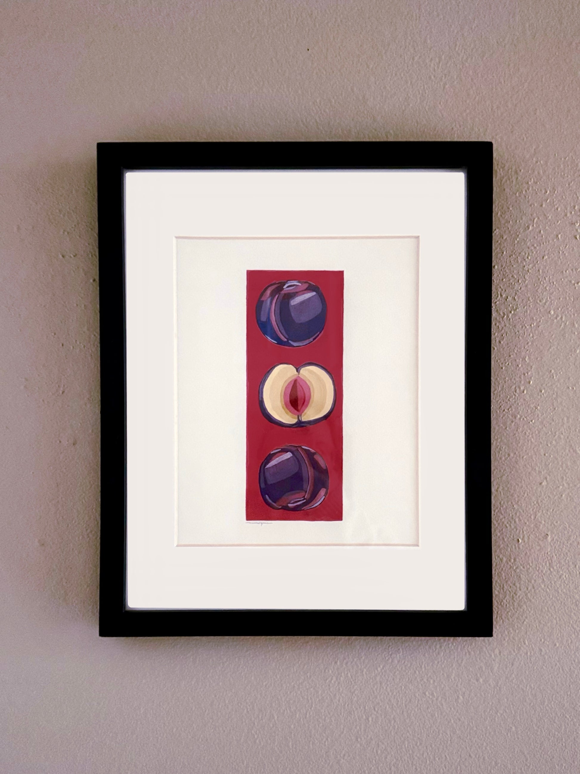 A trio of plums in gouache on 9"x11" cold press 100% cotton watercolor paper. Matted in a 12"x15" black gallery frame ready to hang.