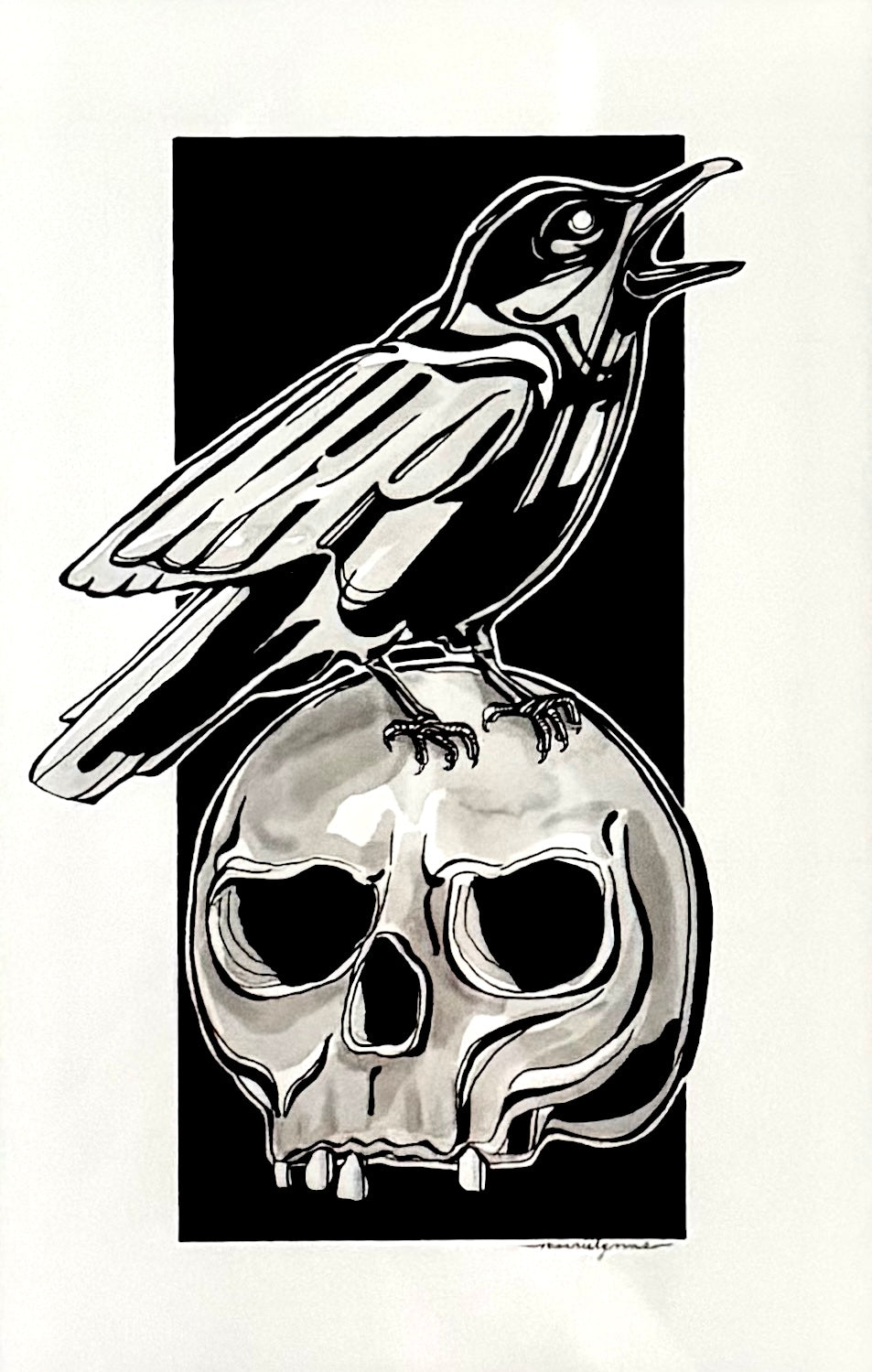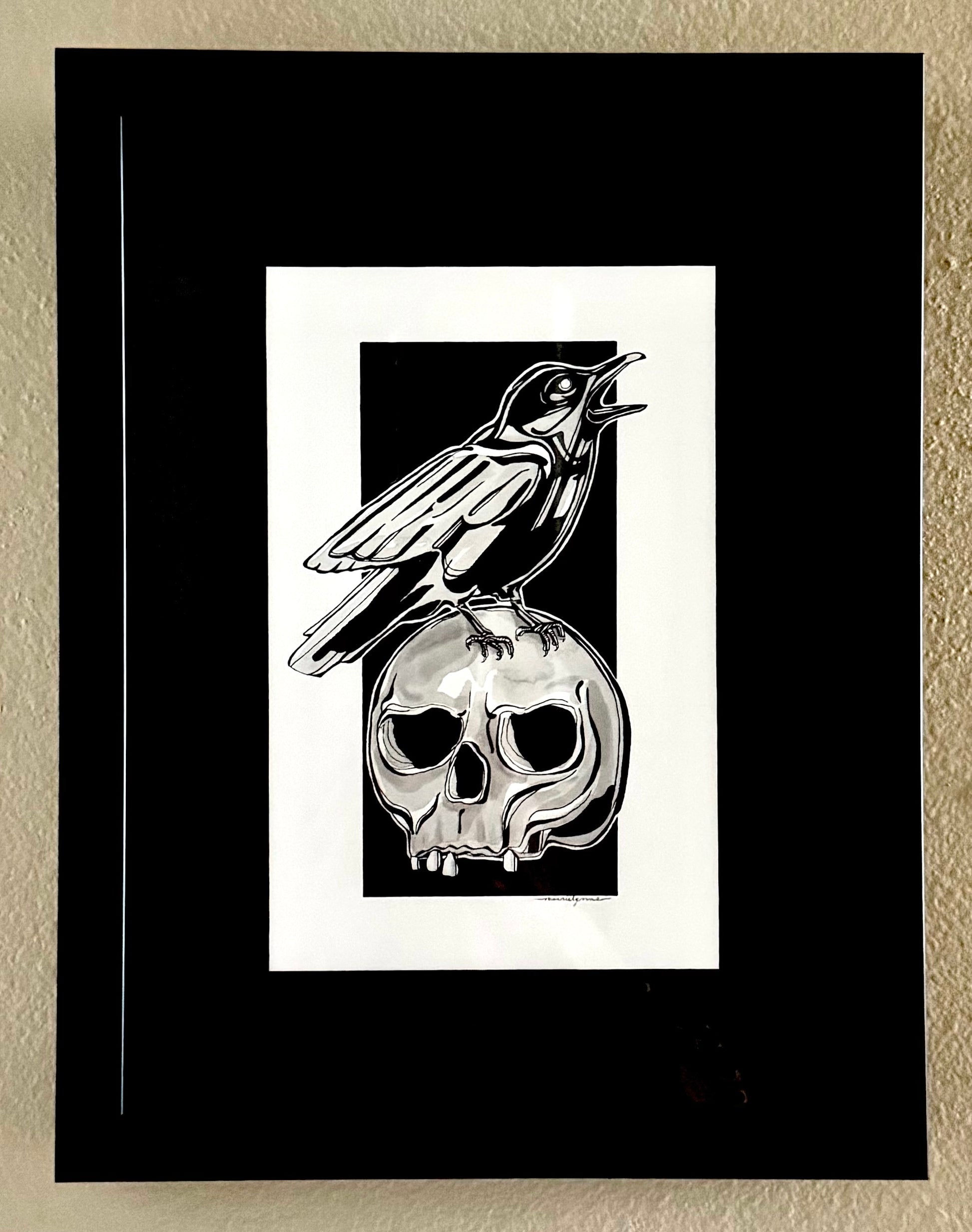 Crow on skull in archival ink on 6"x9" cold press 100% cotton watercolor paper. Matted in a 10.25"x13" matte black wood frame ready to hang.